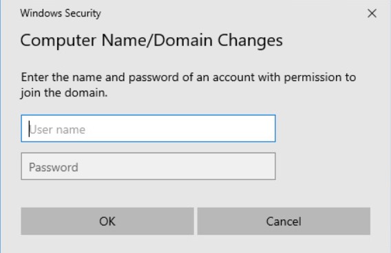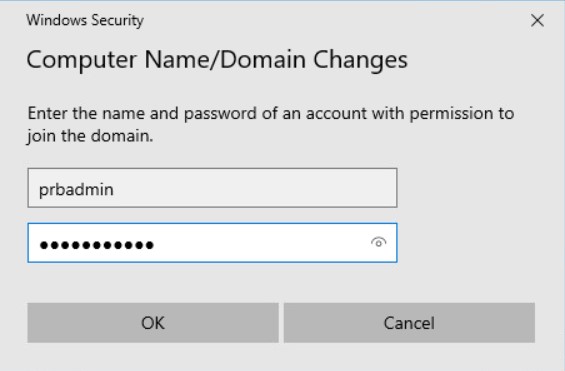 If a Windows Security box comes up for you to enter your username and password, that's means we're able to contact DC-01 to join the domain. From here, we need to enter a Domain Account credential for authentications. This is important. Domain Accounts and objects that are created within Active Directory. When we first promoted DC-01 to be a domain controller our Administrator account got converted to a domain account. So we can use that, but we also created a user account called: prbadmin. I will use this but you can use something else. Again, the user account you created on DC-02 will not work. Only a Domain Account is needed here.
