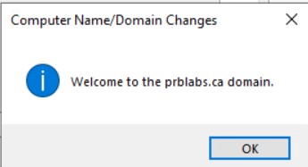 If you see Welcome to the prblabs.ca domain it means you were successful, if you had a incorrect user name and password, it means there is something wrong with your credentials. If you got an insufficient permission message it means that your user account does not have the necessary rights to add a computer to a domain. You can resolve this by adding your user account to the domain admins security group.
