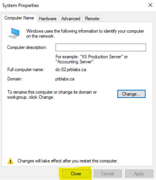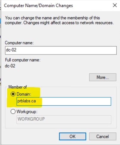 And under Member of I change this from Workgroup to a Domain and I enter prblabs.ca in the Domain field: