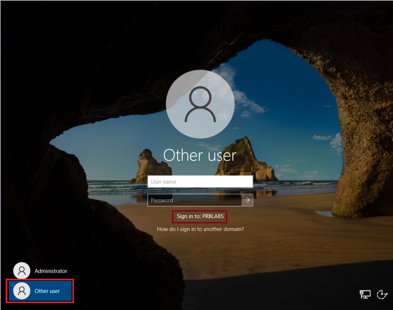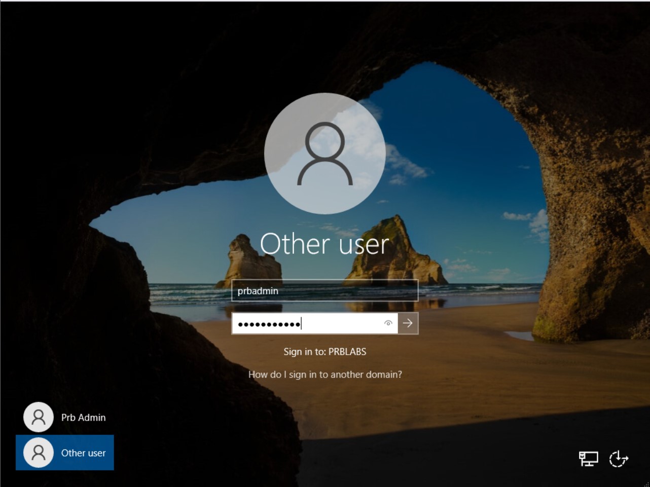 Notice when I click on Other User at the bottom left hand corner of the screen, right below the credentials boxes, I see Sign in to: PRBLABS. What this means that when I'm logging in, I need to use a domain credential to get in. If you're wondering, how can you log in as your local administrator account. If you enter a ./ at the user logon box it will change the sign in location to be your local computer, let's try that.