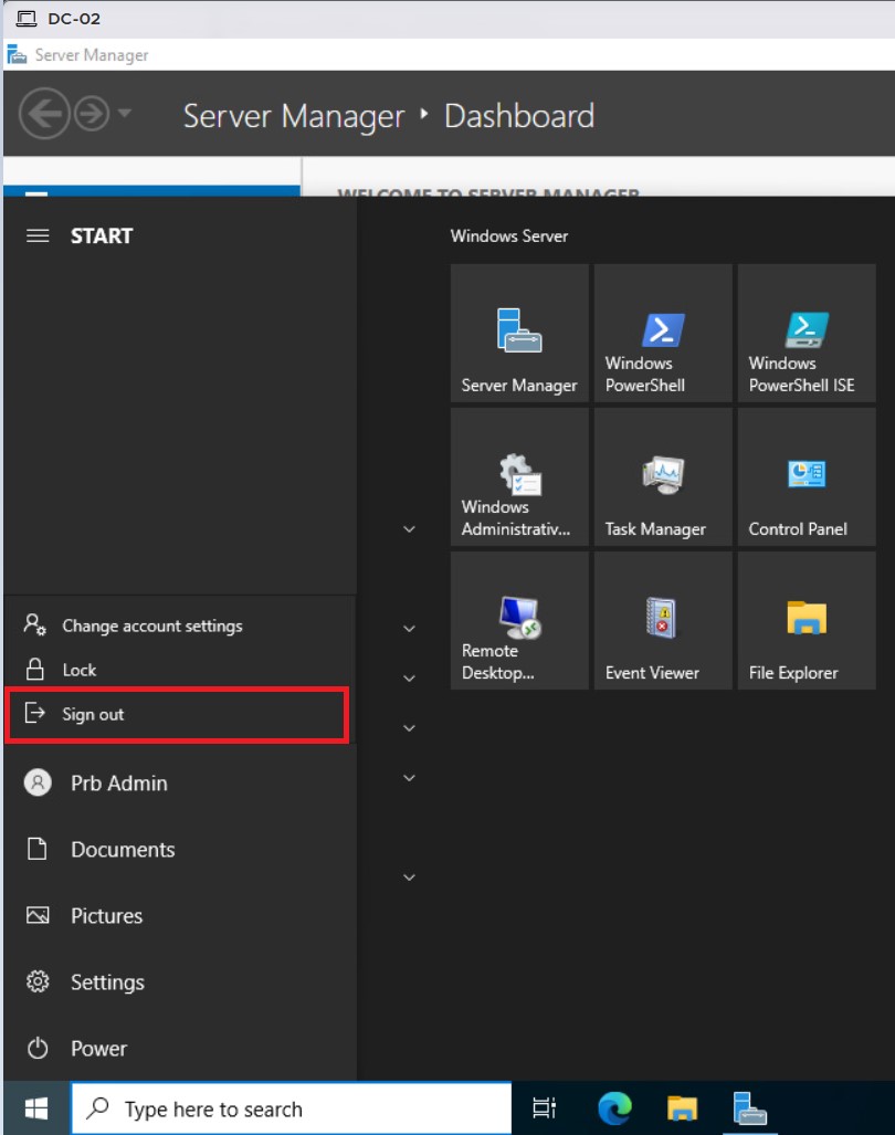 As long as your credentials is correct, it will log you into the desktop as the domain user. Now let's trying logging in as a local user. I will log out of my server by click on the start menu then clicking on my profile icon then logout.