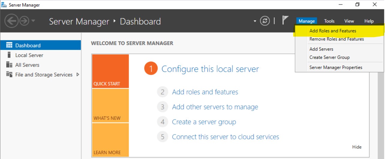 Launch Server Manager and click on Manage then click Add Roles and Features