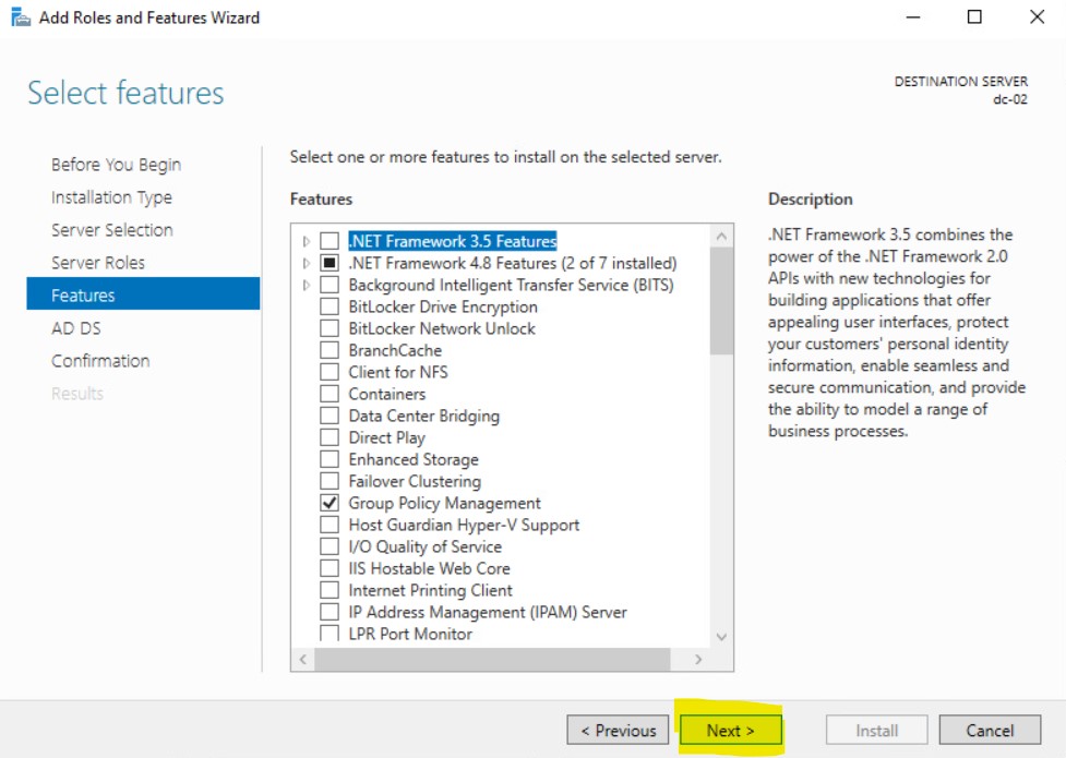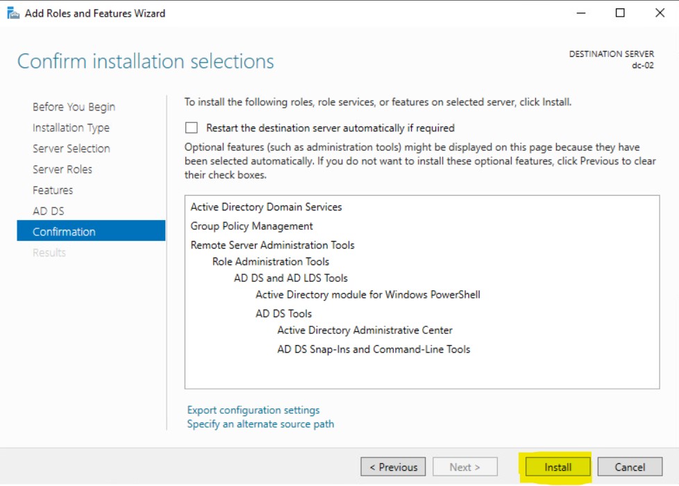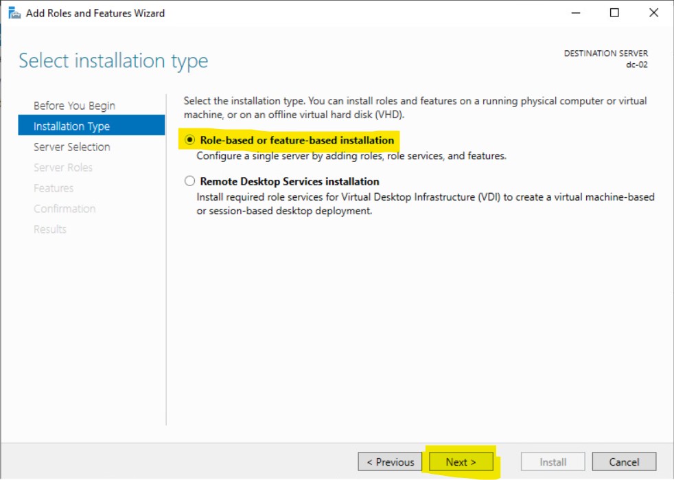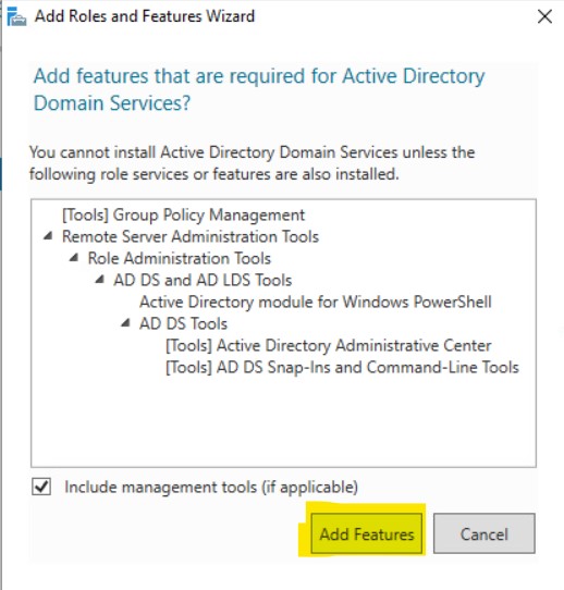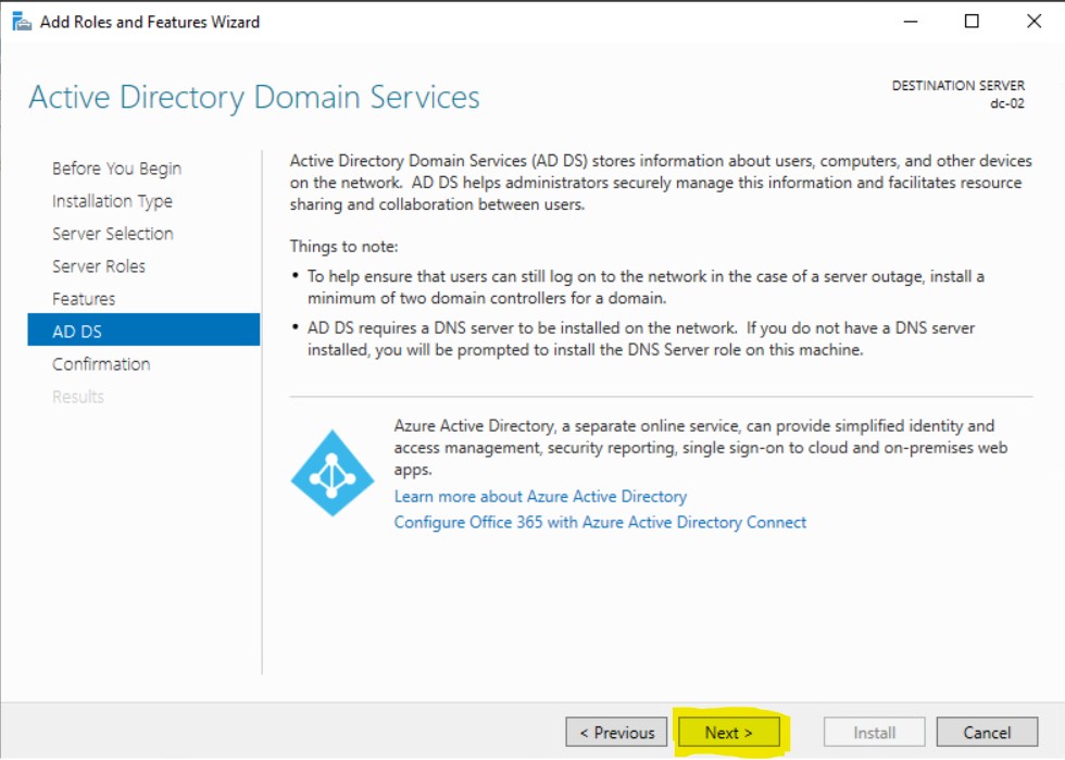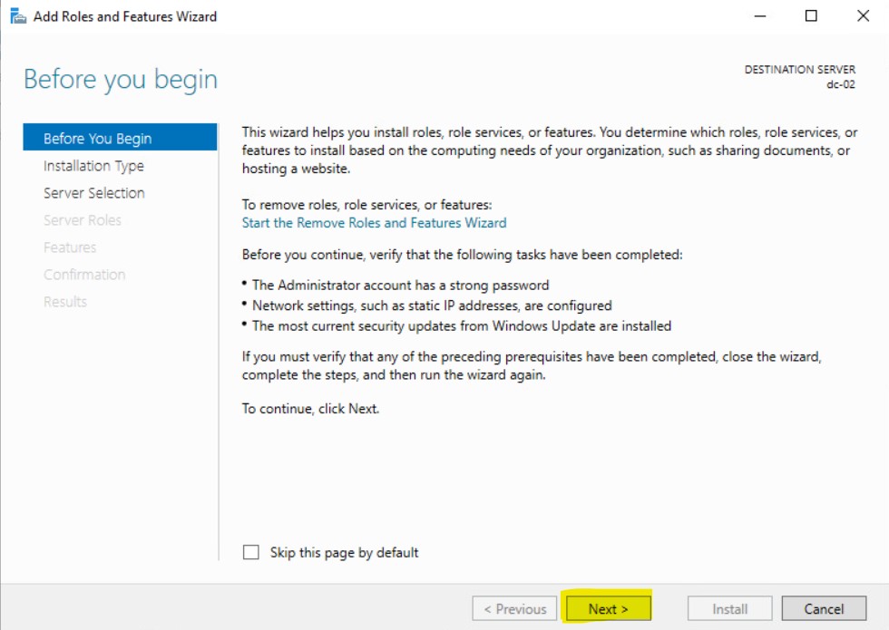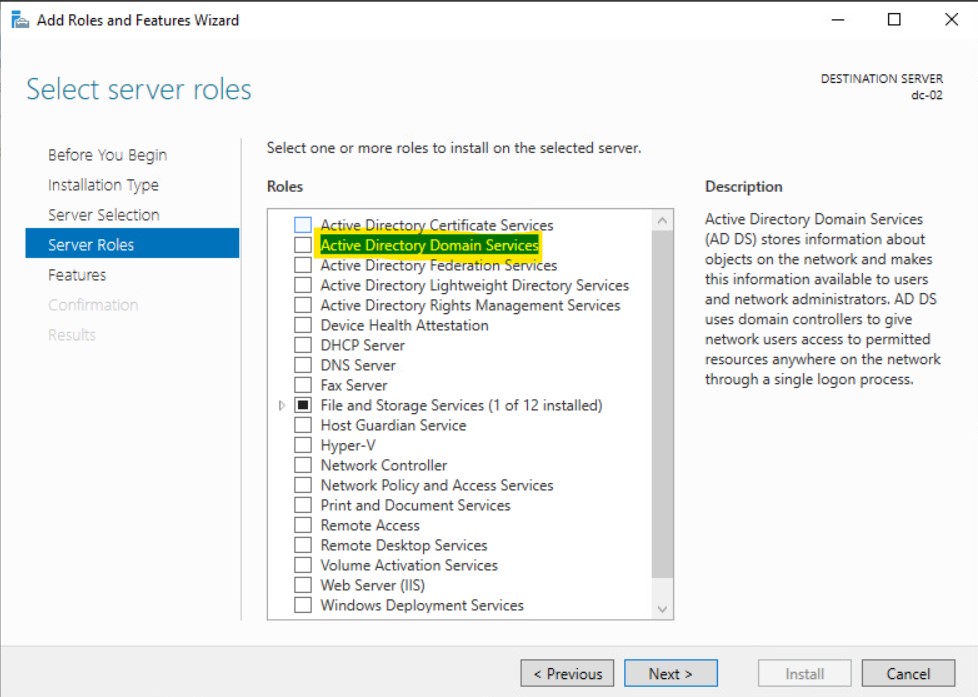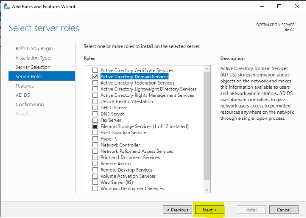First thing, we'll install the the Active Directory Domain Services role. If you remember how to do this, you can go ahead and install it. If you need a refresher you can following the steps below: