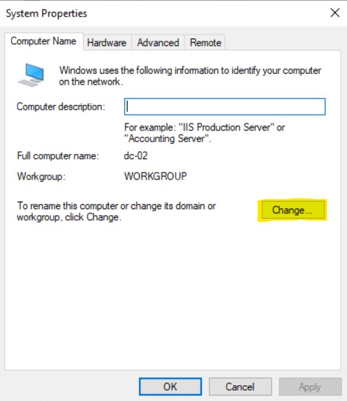 Now to add DC-02 to my prblabs.ca Domain. First I open up Server Manager and go to Local Computer then I click on Computer Name: dc-02