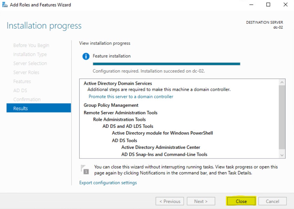 The installation is was successful. Now I can easily click Promote this server to a domain controller, however. I will hit close and show you where you can complete the rest of the task.