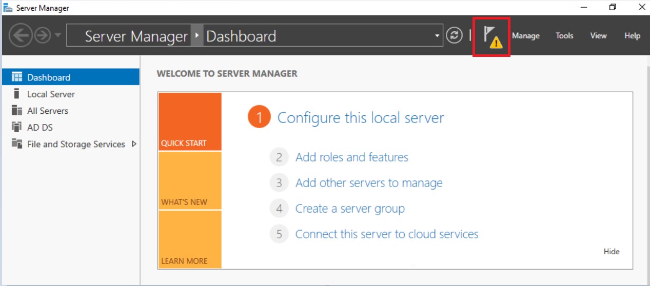Back inside of Server Manager, you should notice a yellow exclamation mark on the flag in the top right hand corner.