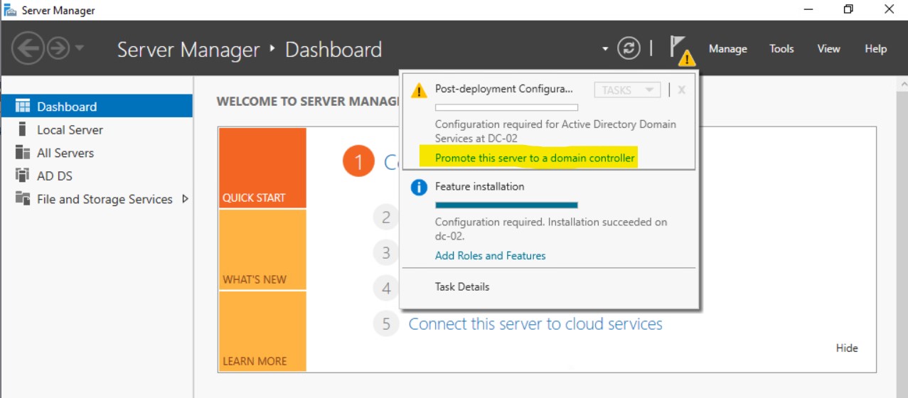 If you click on it, you will see that they are is a Post-Deployment Configuration that needs to be completed. We will click on Promote this server to a domain controller. I wanted to show you this because there are other server roles that has post-deployment configurations. In the event that you mistakenly closed out the completed installation window, you can alway complete your post-deployment task here.
