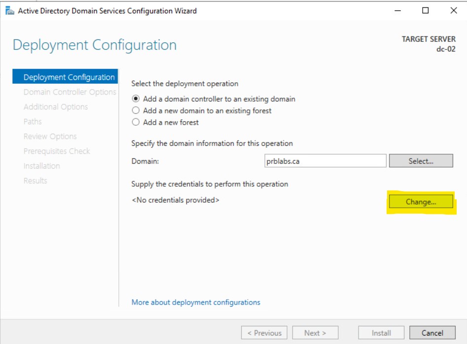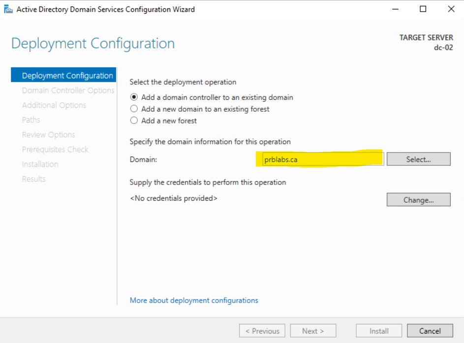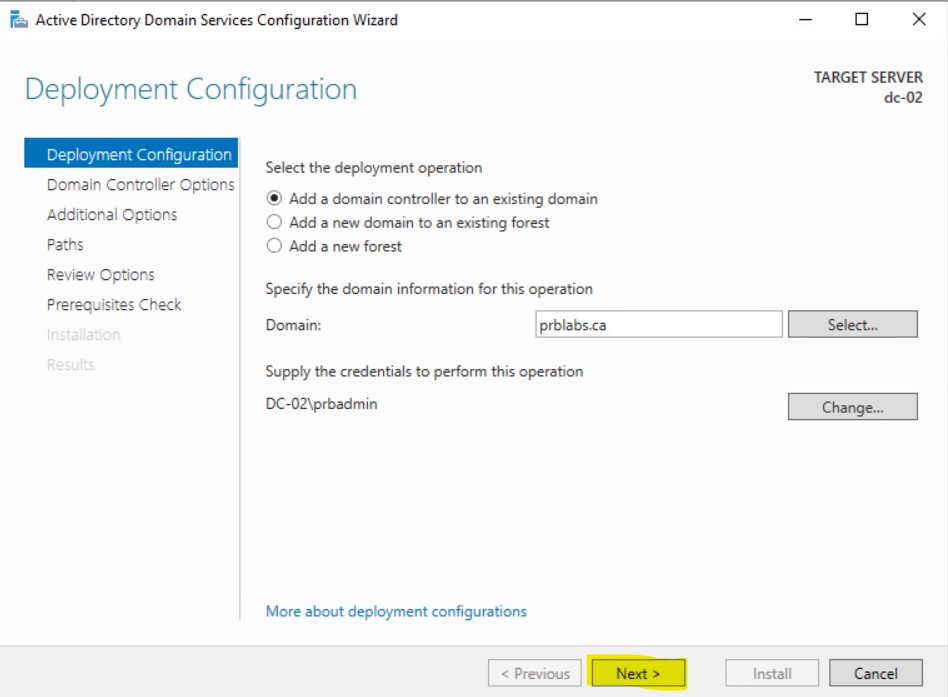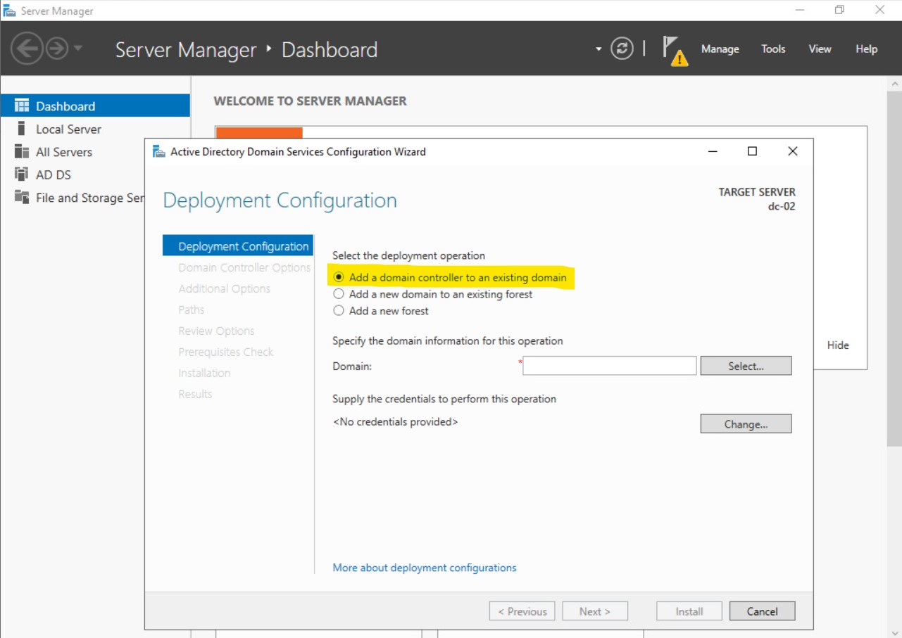 For Deployment Configuration we will choose Add a domain controller to an existing domain.