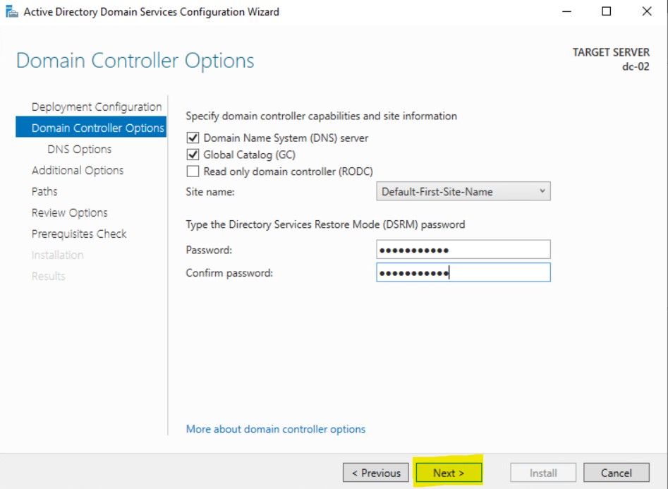 For Domain Controller Options we'll keep all of the defaults and enter a password for Directory Services Restore Mode DSRM. This is a very important password so be sure to remember it.