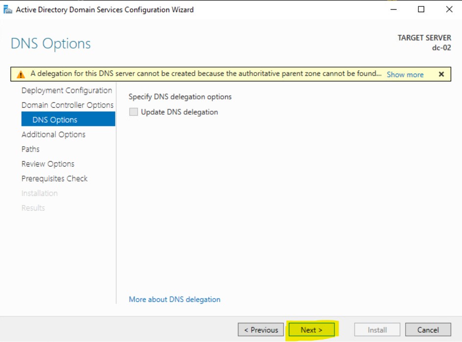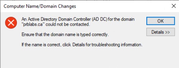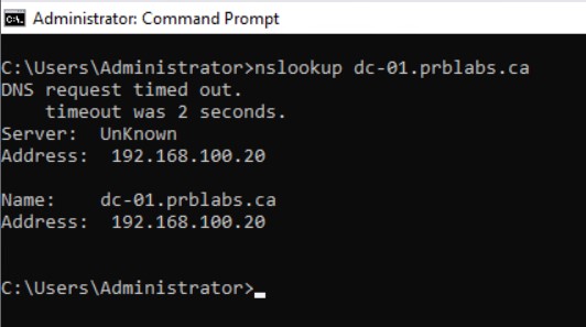 There is a DNS request timed out message, but we were able to resolve dc-01.prblabs.ca to 192.168.100.20. Perfect. let's trying adding DC-02 to our Domain now.