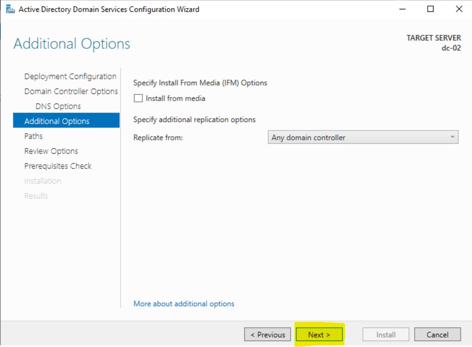 For Additional Options, For the replication options, you can leave Any Domain Controller unless you need to choose something else.