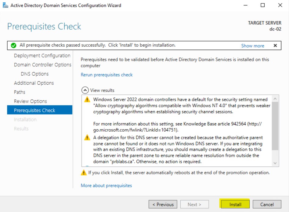 Once the installation is completed. DC-02 will reboot automatically. Once it comes back online. It will officially be a Domain Controller for the prblabs.ca domain.
