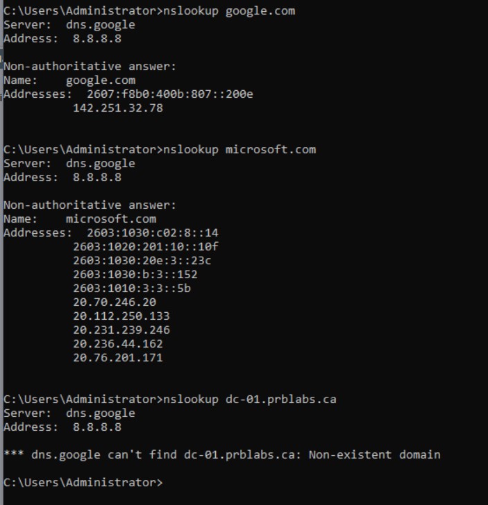 nslookup is a command that we can use to tell us what the IP address of a DNS entry like google.com and Microsoft.com. You can see we can get information on google.com but not one dc-01.prblabs.ca. The fix this we need a DNS server that can resolve the hostname dc-01.prblabs.ca and lucky for us we do have a DNS server that can do that. It's DC-01.