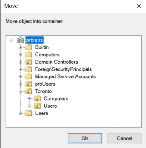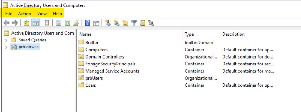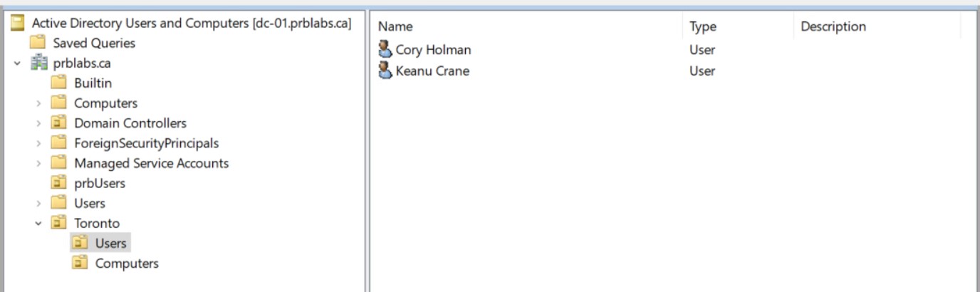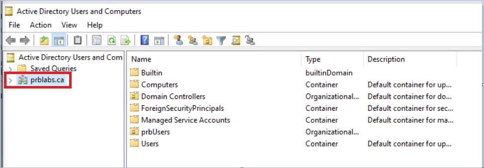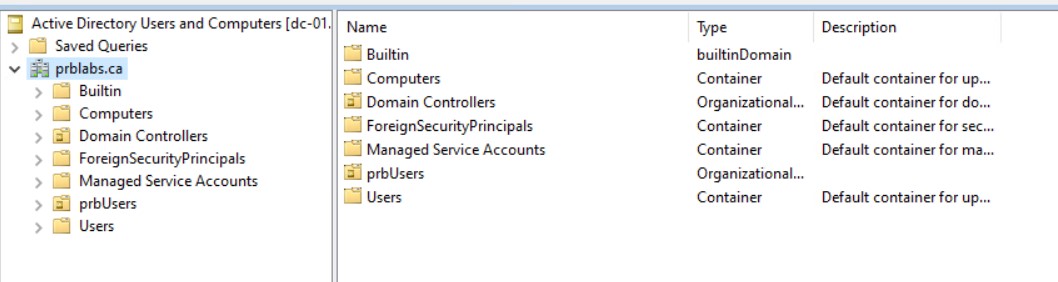 For my organization prblabs.ca, I've already created an Organization Unit called prbUsers and I've created two user accounts. Prb Admin and Prb User 1.