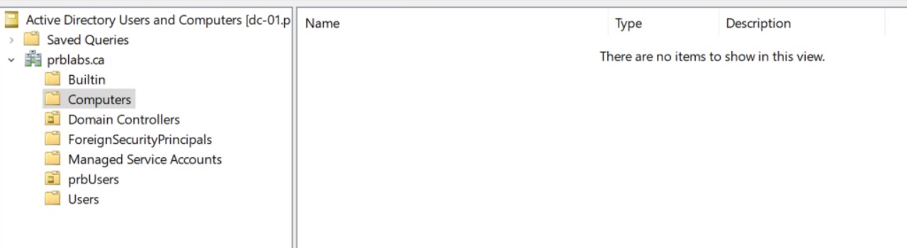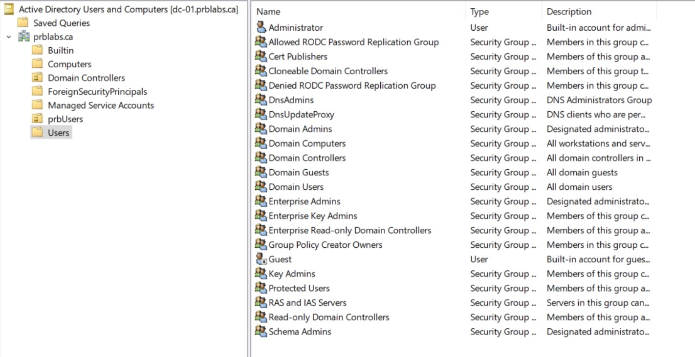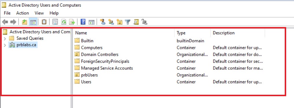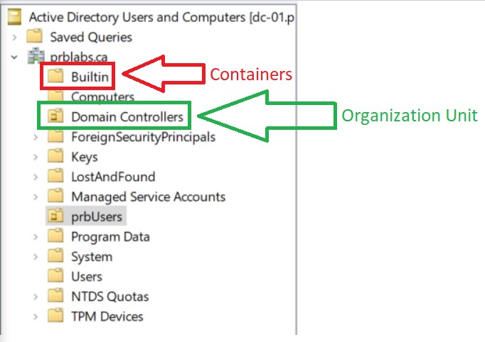 You will see that you have a few items that already exist within Active Directory Users and Computers which were create during the installation. Although these looks like folders, they are not. These are called Organizational Units (OU) and Containers (CN). They they are use to store and organize different objects within Active Directory Users and Computers. If you look closely, you'll notice that the icons are different. The icon's that looks like the Domain Controllers and prbUsers (Note: I created the prbUsers OU during my initial installation of Active Directory on DC-01) are called Organization Unit (OU) and the rest of the icons Builtin, Computers, Keys and etc. are called Containers.