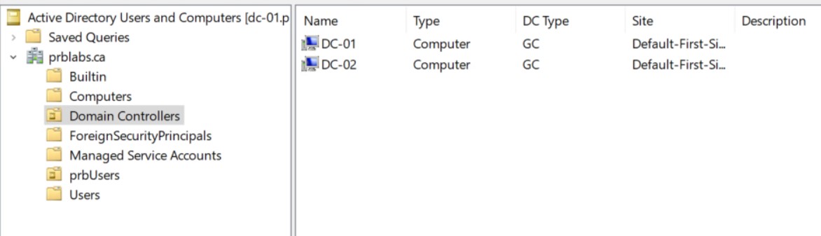 Next is the Domain Controllers Organizational Unit (OU). Notice I said Organization Unit and not container. In this OU we can see DC-01 and DC-02. By default whenever we add a new domain controller to our Domain, the objects for these computers will be added automatically to this OU.