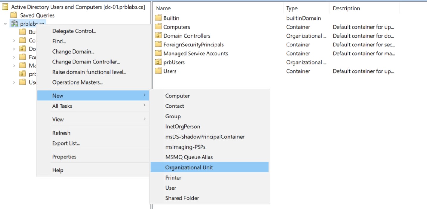 First I will Right Click on prblabs.ca and choose New then Organizational Unit