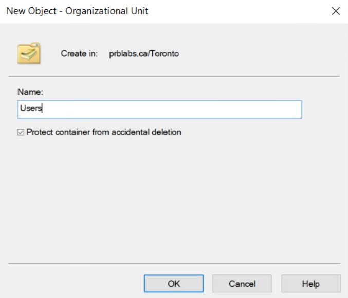 Once the New Object - Organization Unit Window comes up, you can enter the name of your Organizational unit. I will call mine Toronto but you can name yours anything you want. You will see an option at the bottom of that you can uncheck, but really, there is no reason to uncheck it. Having this box checked will prevent users from accidentally or intentionally right clicking and deleting the OU, this check-mark prevents that from happening.
