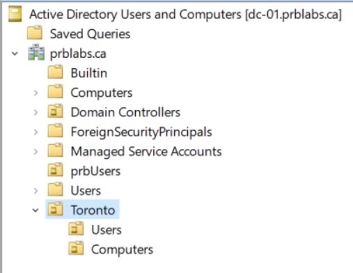 Once my Toronto OU has been created, I will proceed and create my two child OUs under Toronto. I can do this by Right-Clicking on Toronto and clicking New then Organizational Unit.