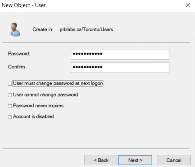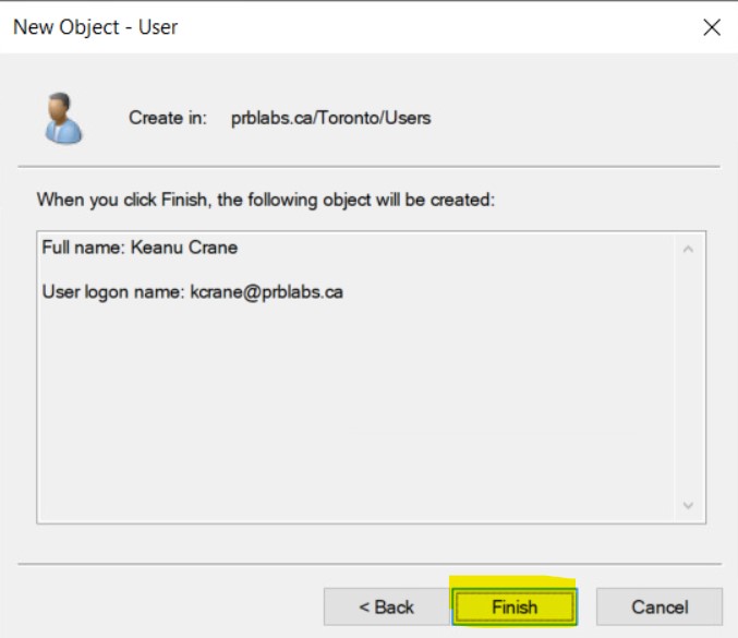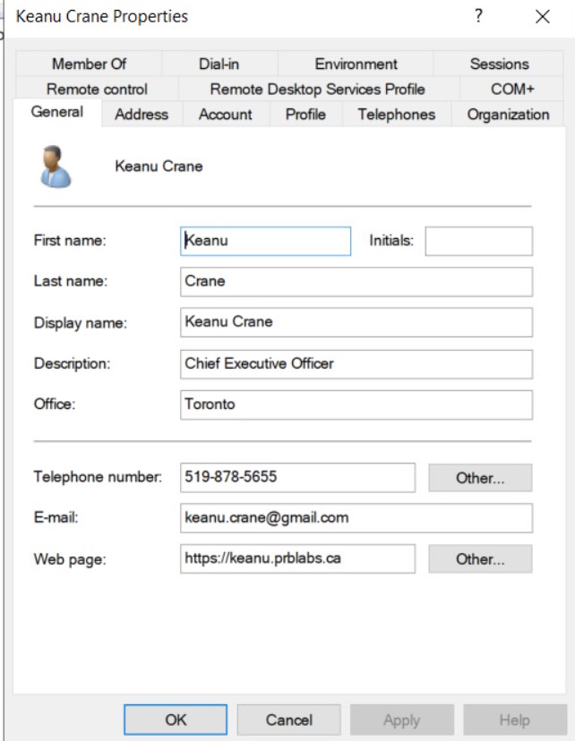 Perform this task will bring up the New Object - User window. From here you have some information to fill in. Let's see we're creating a user account for our CEO of Prblabs. And his name is Keanu Crane. We can start filling in this information.