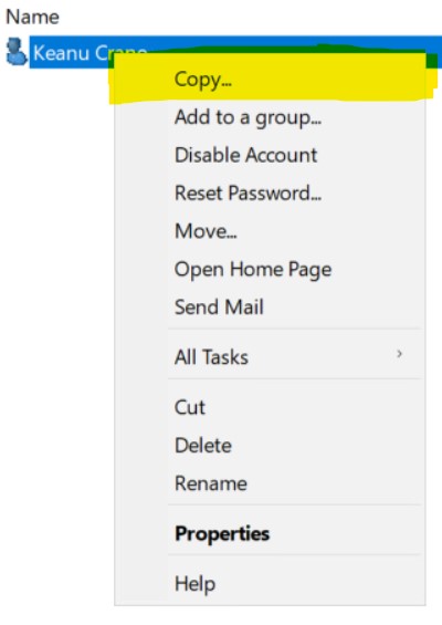- Copy: The copy might not do what you think it does. If you're thinking that you can copy the account and paste is inside of another OU, you can mistaken. Let's say for example, you are hiring another accountant for your team, and this new accountant needs the exact same access as Chelsea the current account. Chelsea's Active Directory User account already has every security group that the new accountant will need password to. That's what the Copy option does, it will take all of the relevant settings from Chelsea and will apply it to the new accountant. Of course it won't apply user details, like first name, last name, user login name, etc but details like address and security groups will be carried over.