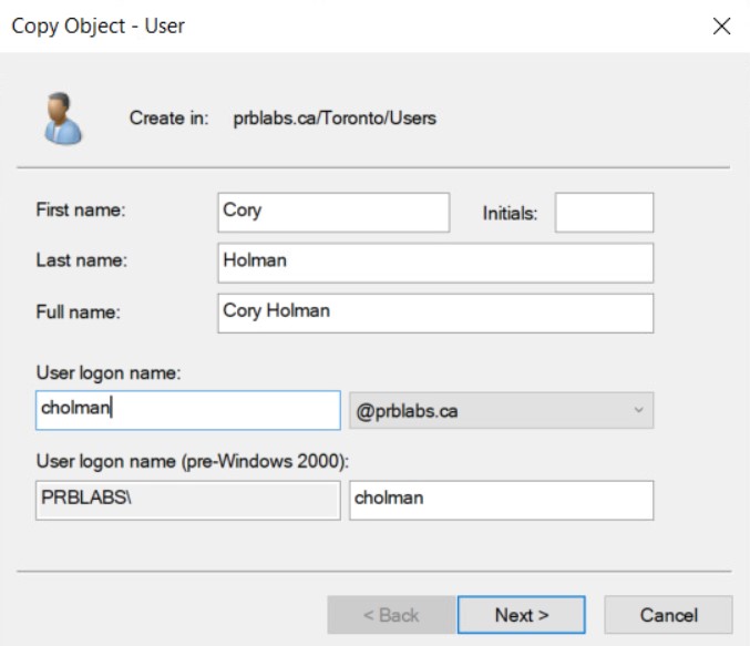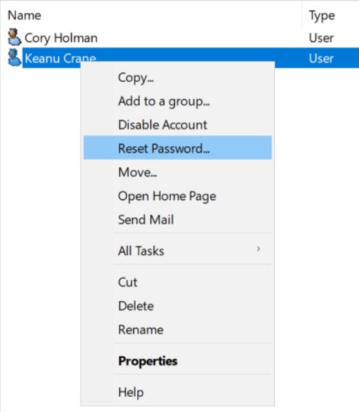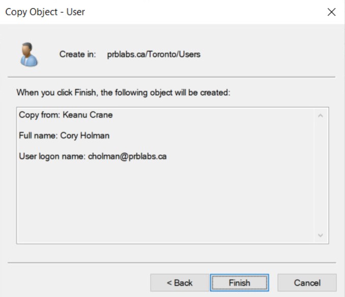 And there you know, I just created Cory's account by copying Keanu's. Now, what I just did, doesn't really serve any purpose besides showing you how the copying function works. Keanu isn't added to any security groups or has any details about his account filled in, really not nothing was transferred over to Cory's account, but we will revisit this option later as we continue to build our Windows Server Infrastructure.