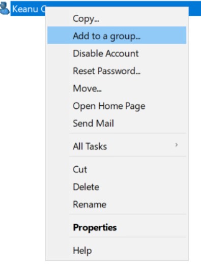 - Add to a group: This option does exactly what it says it will do, add users to group. Remember you had some builtin groups and other security groups within the Users OU, not the one we're in but the one that comes preinstalled with in Active Directory, well using this option, we can add our Keanu user to any one of those groups. Let's try this as well. Right Click on Keanu Crane account and choose add to group.