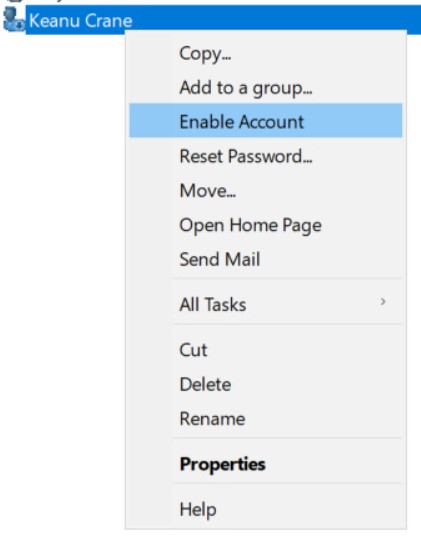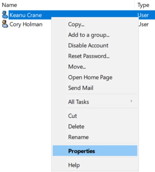 If I were to right click on my Keanu Crane user account, I can see the following information