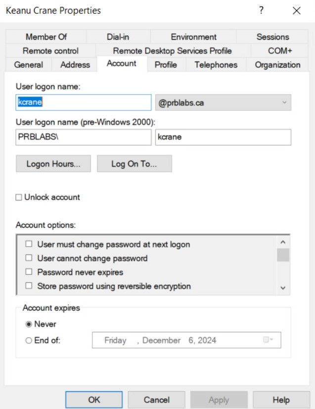 For my user Keanu Crane the User logon name will be [email protected]. You will notice that the **User logon name (pre-Windows 2000): is also automatically generate. This is really just for legacy protocols and applications. Sometime you might find yourself user it.