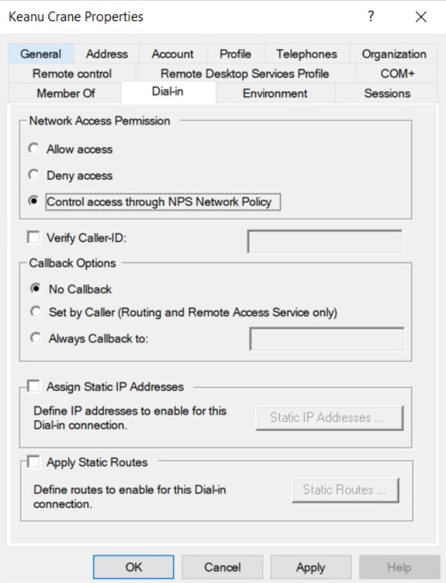 Use Case: This setting determines whether the user can access the network remotely. In organizations that require secure access, it’s common to use NPS policies to enforce remote access rules based on group memberships, device health checks, and other criteria.